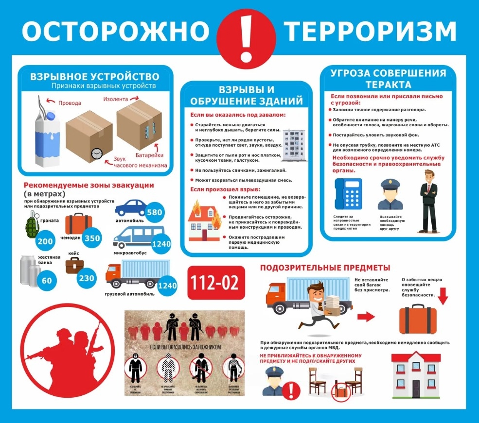 В целях личной безопасности и безопасности других людей не прикасайтесь к забытым бесхозным вещам, предметам, подозрительным транспортным средствам. Постарайтесь исключить доступ к ним других лиц. Отойдите на безопасное расстояние 250-300 метров и немедленно сообщите о потенциально опасной находке по телефонам: "02" (полиция), "102" и "112" (универсальный номер вызова экстренных, оперативных служб с мобильных телефонов), при возникновении чрезвычайных ситуаций необходимо звонить по единому телефону "01", "101" или "112".